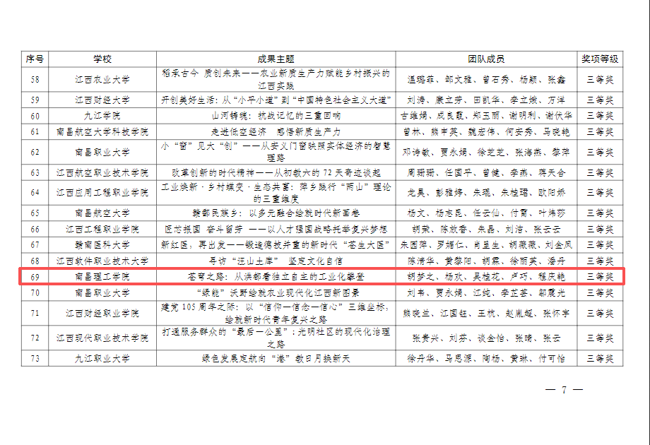历经全省各高校积极组织、广泛动员,本次评选共收到229项来自全省各高校思政课教师的成果作品参评。经过多轮严格评审、层层遴选,最终确立73项成果作品荣获一、二、三等奖,我院胡梦之、杨欢、吴桂花、卢巧、程庆艳老师团队凭借《苍穹之路:从洪都看独立自主的工业化攀登》这一优秀成果,成功斩获三等奖,实现在该项赛事上的零的突破!这份荣誉,是对我院教师扎实的理论功底、创新的教学设计与鲜活的实践呈现的高度认可,更是我院深耕思政课教学改革、赋能教师专业成长的有力印证。